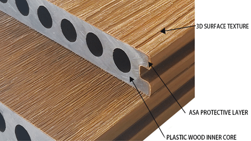 Últimos diseños: vienen con una apariencia de veta de madera con relieve profundo para una apariencia más natural. Tiene una textura distintiva que lo distingue de las plataformas de coextrusión. Plataformas de 2.ª generación (decking compuesto cubierto).